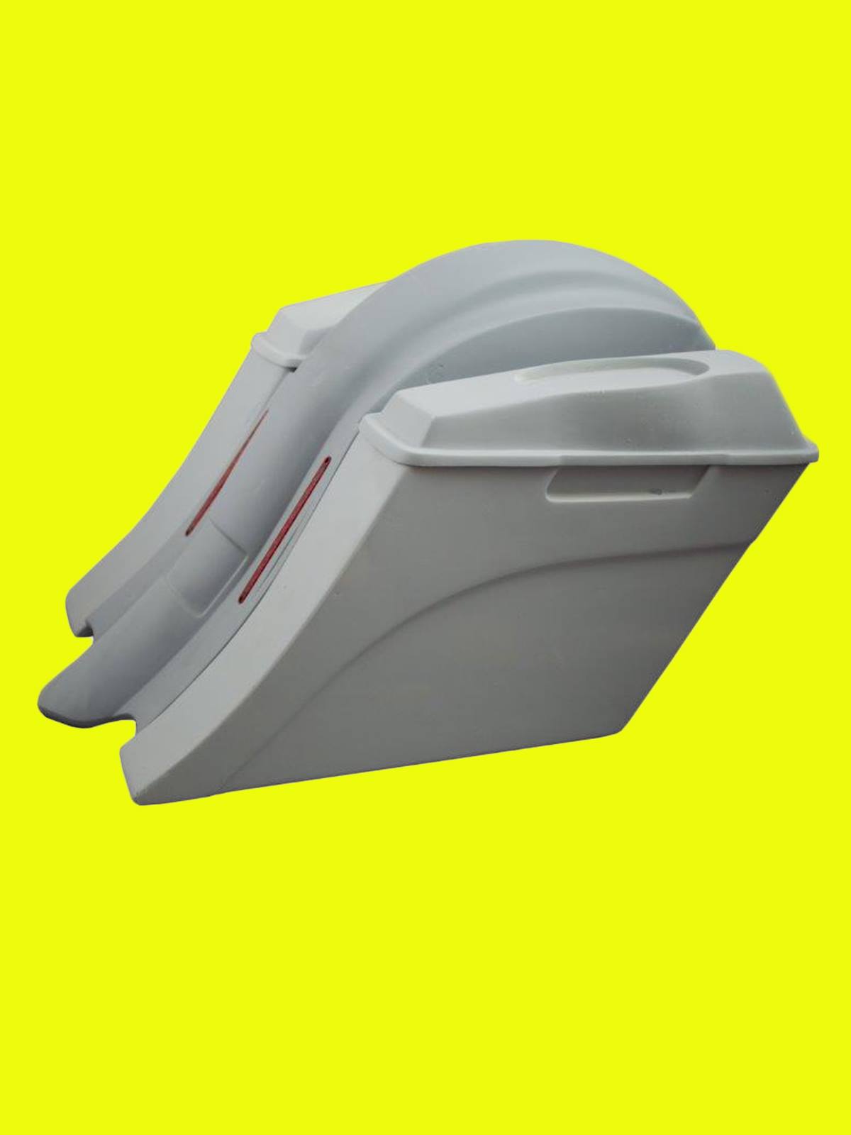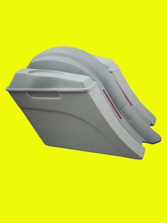 This is a brand new, in gel coat with a coat of primer, never mounted 6" down and 9.5" out Softail and Touring stretch saddlebags & Replacement Rear Fenders w/ factory recessed LED tail lights (Harley stock hardware will fit). You will need to sand, prep, minor filler, mockup, primer & paint before installing as these are unfinished. All items pictured are included in this listing. These do not include hardware. Stock Harley hardware will fit. All Items are made in high quality hand laid fiberglass.
