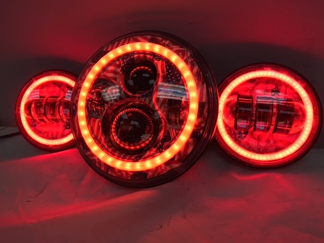 7" DAYMAKER AMERICAN FLAGS DESIGN Headlight Dual 4.5" - 4 1/2" Auxiliary Spot Passing LED Fog Lights Red Halo Bulb Harley SET